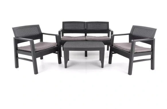 Stolová sestava se skládá ze 2 pohodlných křesel, lavice a stolku v imitaci umělého ratanu s UV filtrem.