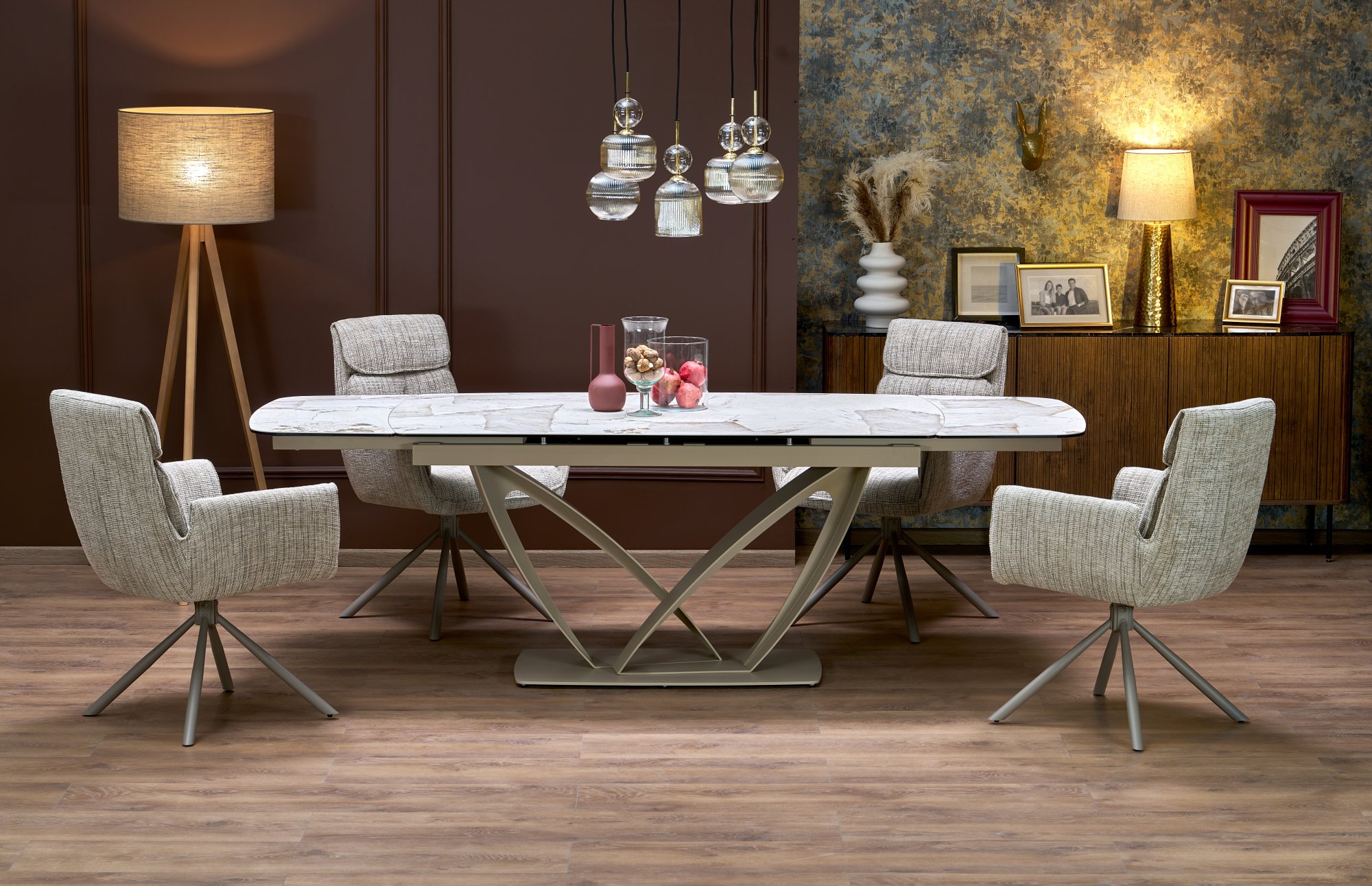 rozmery: 160-240/90/77 cm, rozkladací stôl, materiál: keramika / sklo / oceľ lakovaná práškovou farbou, farba: doska – béžový mramor, noha – kašmír