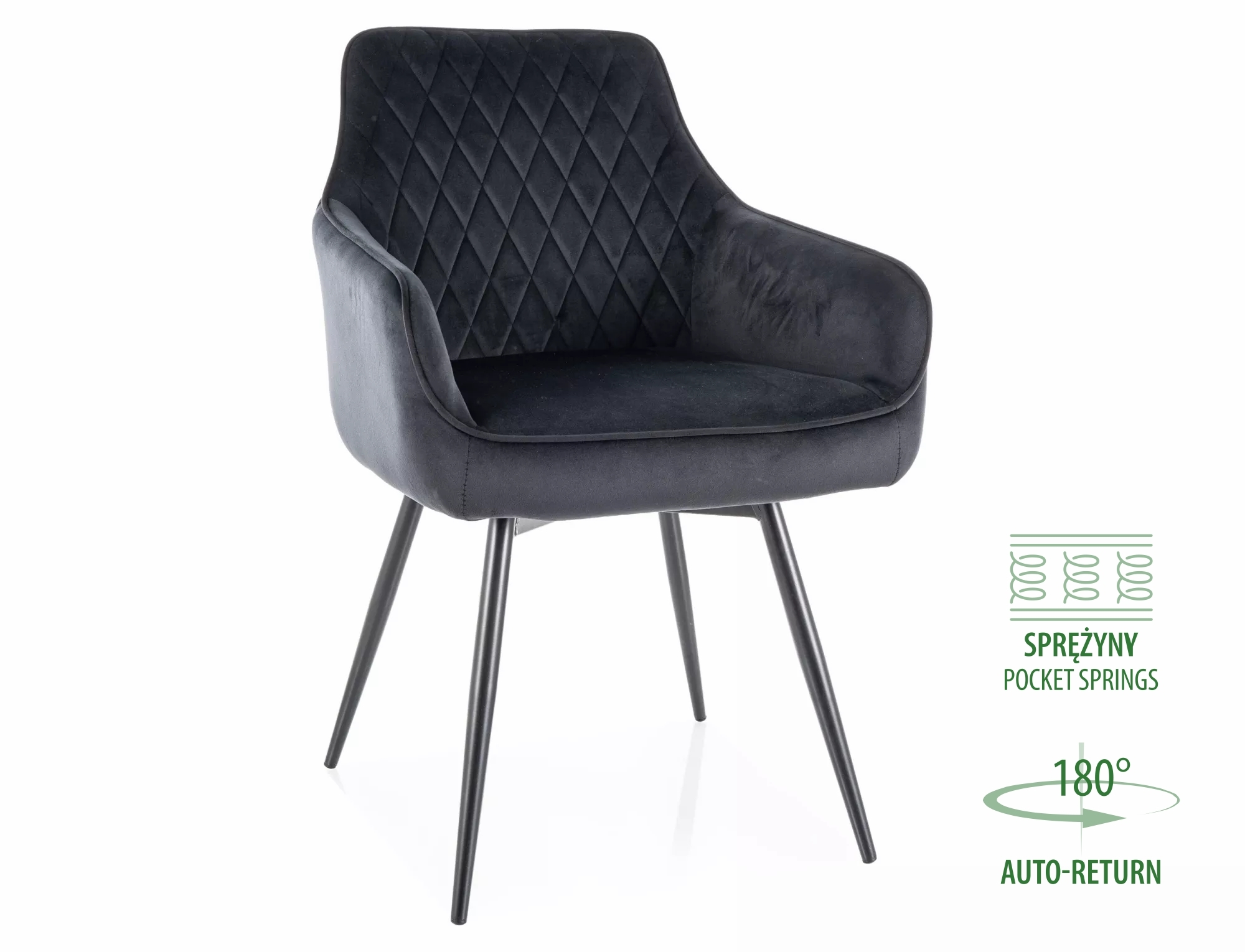 Stolička, čalúnenie: zamatová látka: Bluvel 19, rám: kov, farba: čierna / matná čierna. Funkcia automatického návratu - sedadlo sa otáča o 180 stupňov s funkciou návratu do pôvodnej polohy. Taštičkové pružiny v sedadle.
