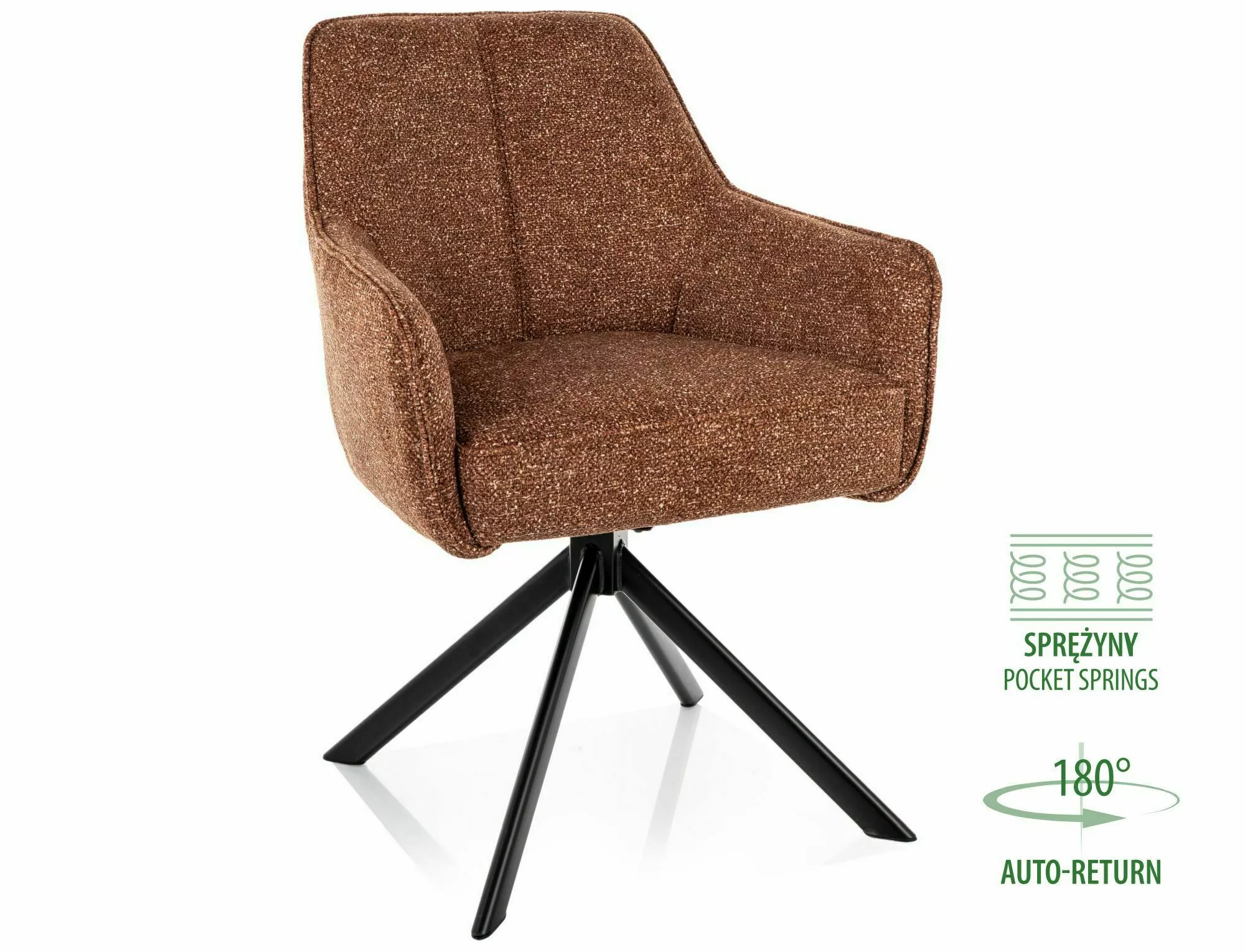 Stolička, čalúnenie: látka Leo, rám: kov, farba: camel 35 / matná čierna. Funkcia automatického návratu - sedadlo sa otáča o 180 stupňov s funkciou návratu do pôvodnej polohy. Sedadlo je vybavené taštičkovými pružinami.