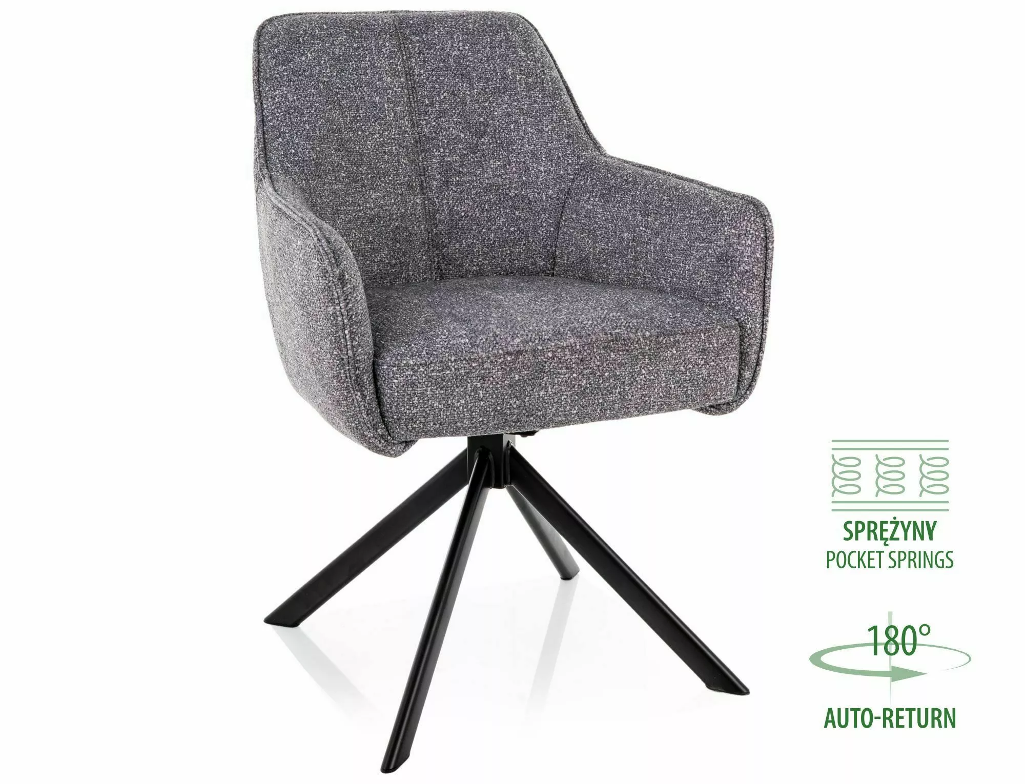 Stolička, čalúnenie: látka Leo, rám: kov, farba: sivá 07 / matná čierna. Funkcia automatického návratu - sedadlo sa otáča o 180 stupňov s funkciou návratu do pôvodnej polohy. Sedadlo je vybavené taštičkovými pružinami.