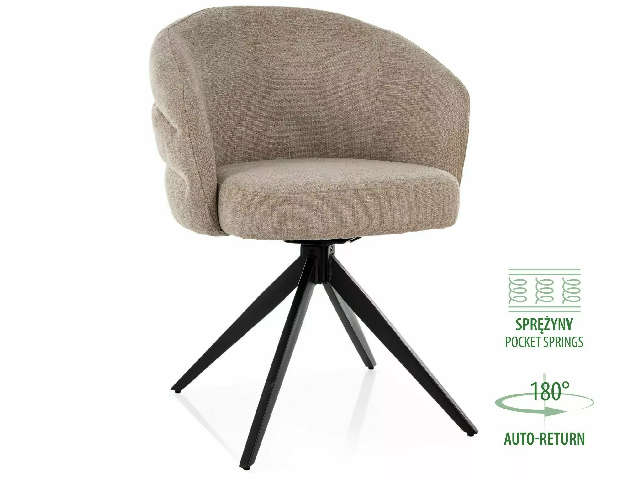 Stolička, čalúnenie: látka, rám: kov, farba: 250 béžová / matné čierne čalúnenie. Funkcia automatického návratu - sedadlo sa otáča o 180 stupňov s funkciou návratu do pôvodnej polohy. Sedadlo je vybavené taštičkovými pružinami.