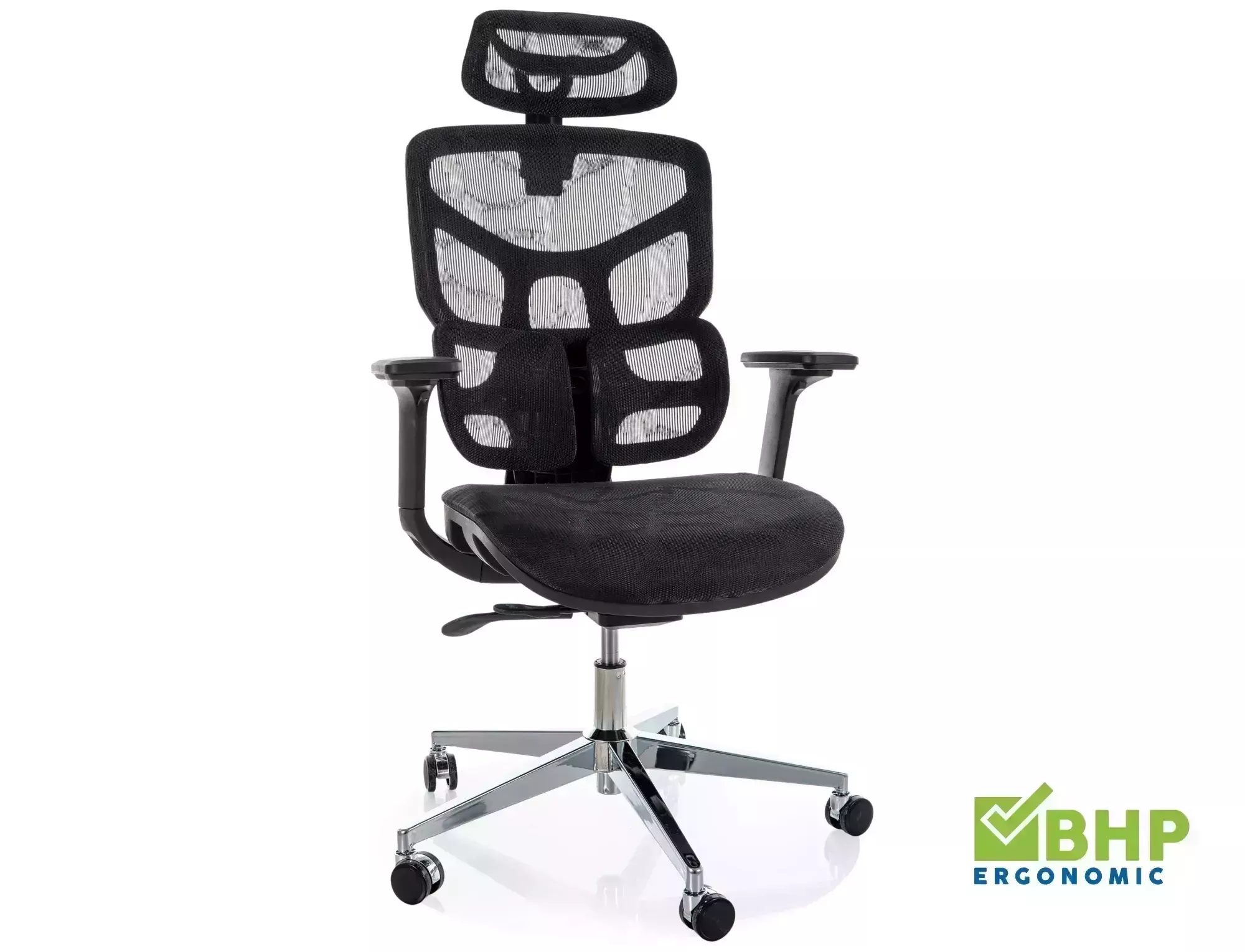 Ergonomické kreslo, sieťovina, farby: čierna, multiblokové, nastaviteľné: 4D podrúčky, hĺbka sedadla, bedrová opierka, opierka hlavy.