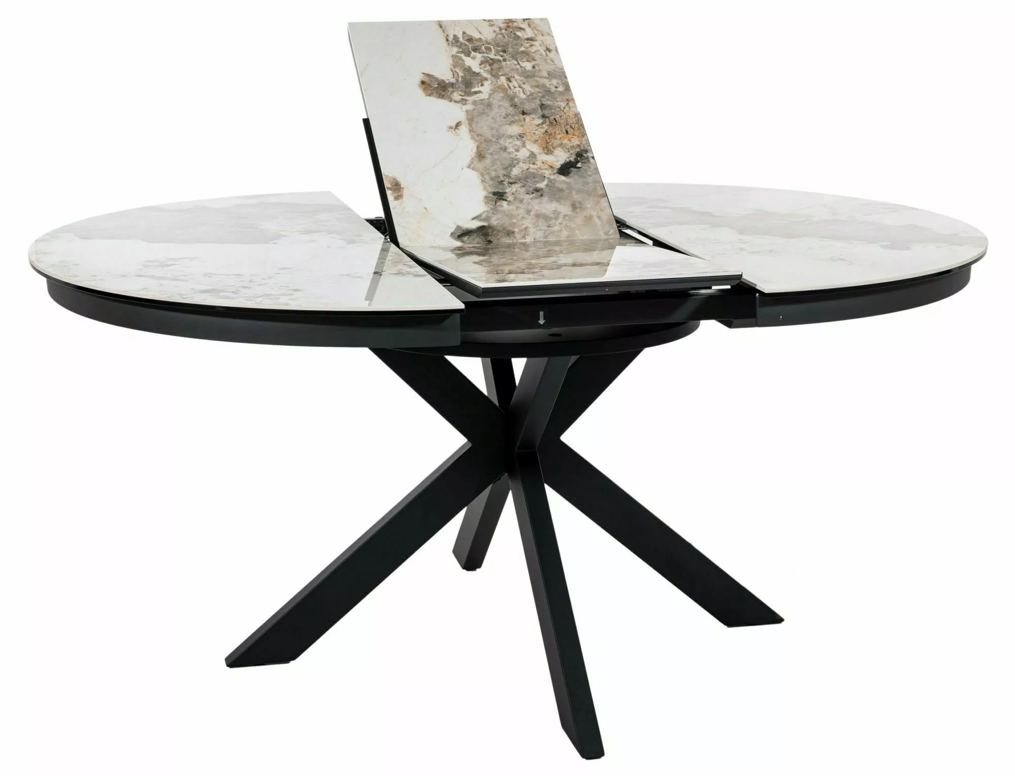 Rozkladací stôl, doska: tvrdené sklo + keramika Pandoro, rám: kov, farba: lesklá biela / matná čierna.