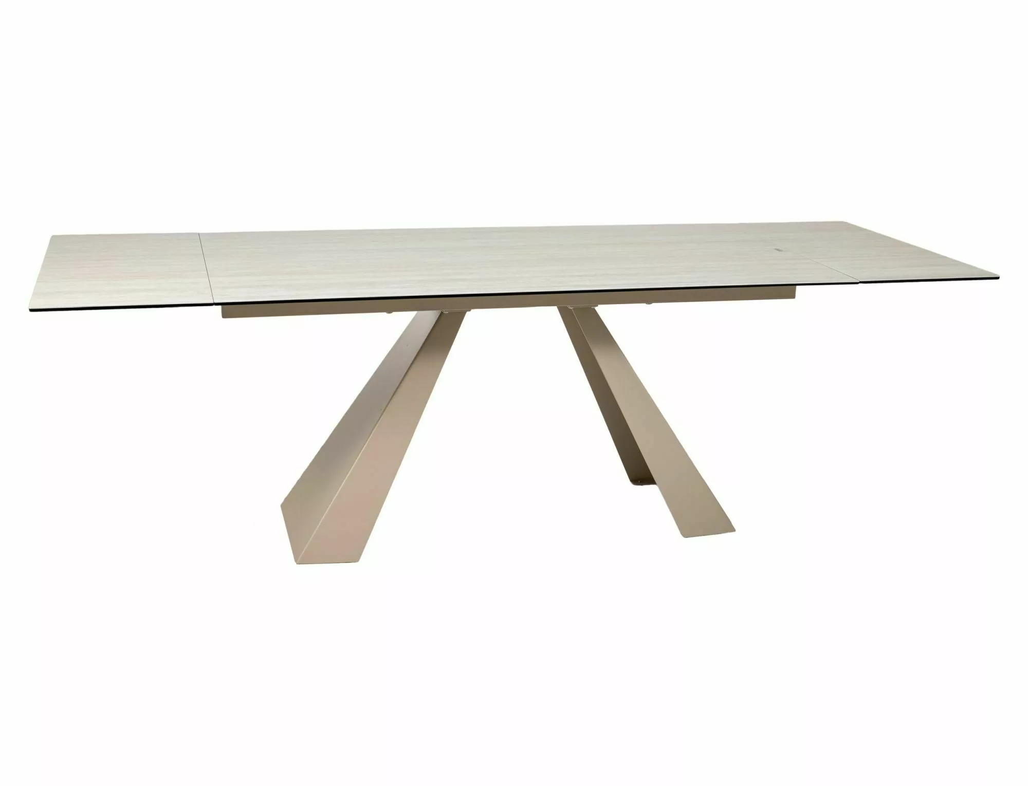 Rozkladací stôl, doska: tvrdené sklo + travertínová keramika, rám: kov, farba: matná béžová / kašmír.