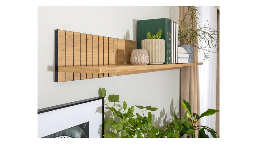 Skvelým doplnkom zariadenia je nástenná polica Lamea s dĺžkou 135 cm a hĺbkou 20 cm. Poskytuje ideálny priestor na vystavenie dekorácií, suvenírov alebo obľúbených kníh. Zadná doska police zároveň chráni stenu pred znečistením a dodáva celku dekoratívny vzhľad.