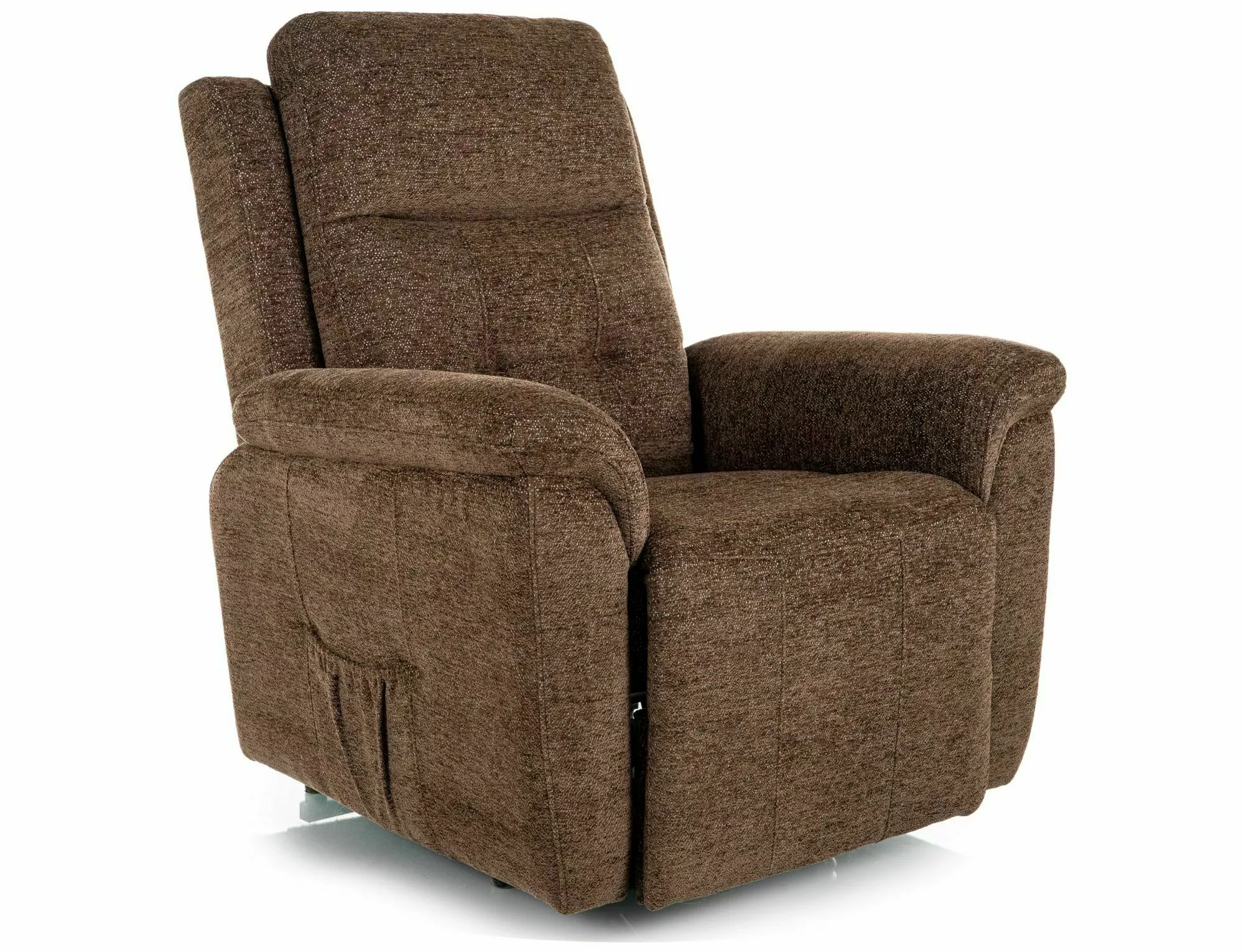 Elektrické polohovacie kreslo, látka: Raven, farba: cappuccino 45. Ovládanie káblovým diaľkovým ovládačom, elektricky nastaviteľná bedrová a hlavová opierka, praktické vrecko na pravej strane. Rozmery kresla: A - 105, B - 87, C - 49, D - 50, E – 92÷160 cm.