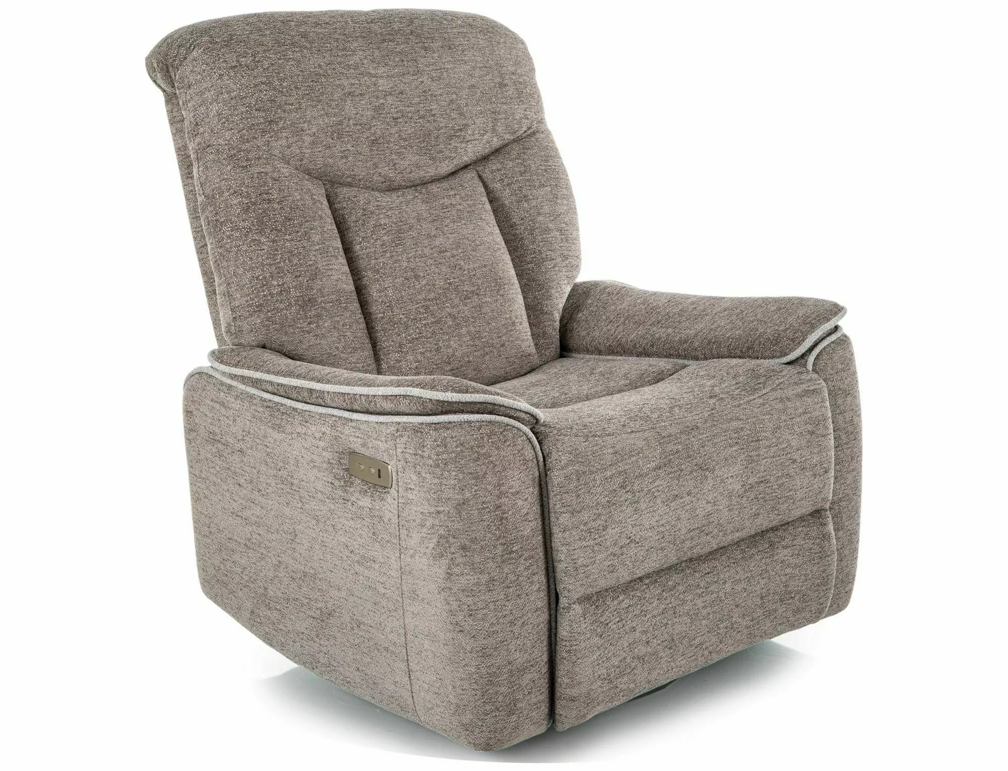 Elektricky polohovateľné kreslo s funkciou hojdania, látka: Raven, farba: sivá 07. Sedadlo otočné o 360 stupňov, funkcia hojdania funguje aj v zloženej polohe, USB port. Rozmery kresla: A - 106, B - 92, C - 50, D - 52, E - 92 a po zdvihnutí nôh 168 cm.