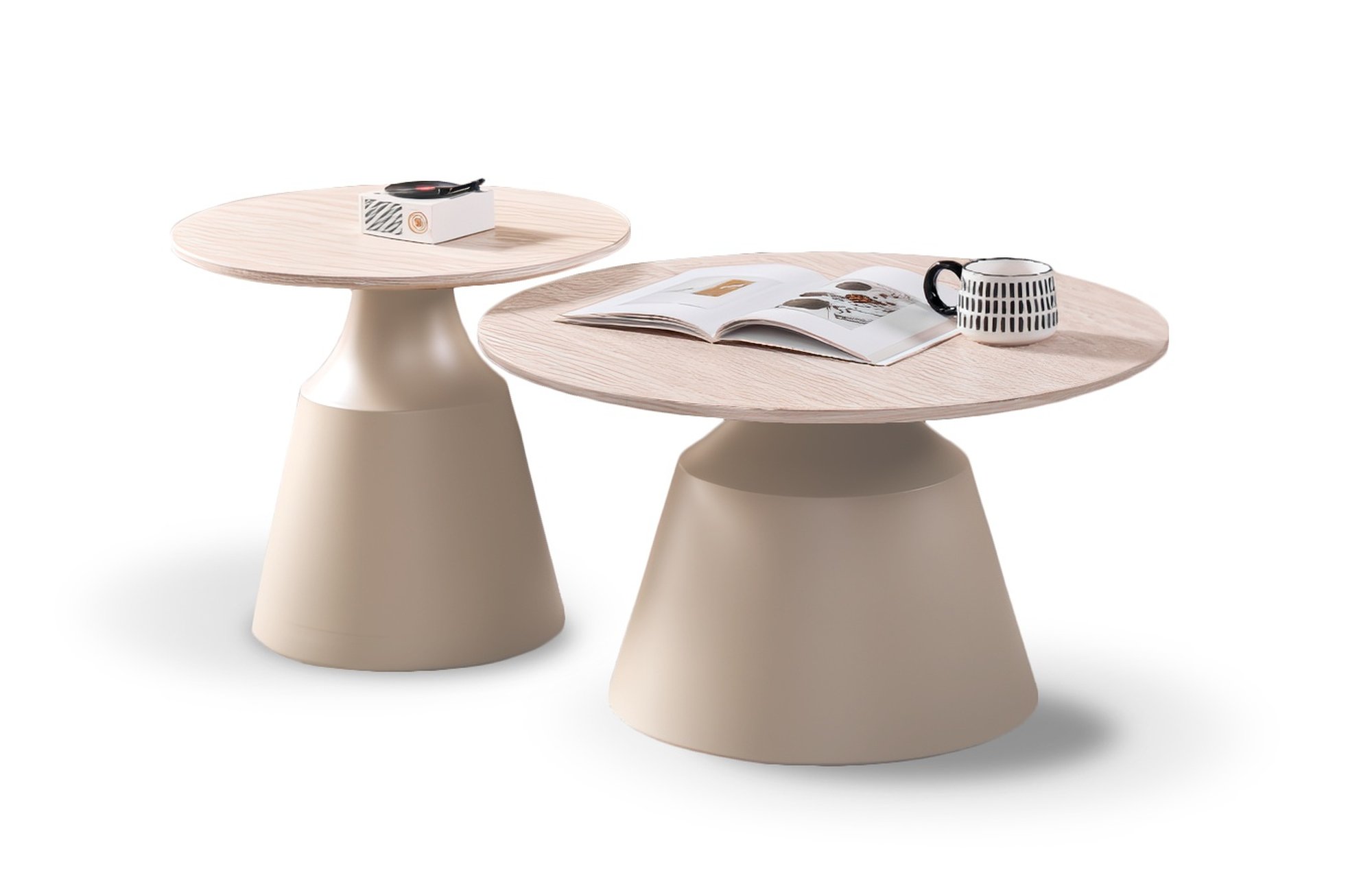 rozmery: 70/42 cm a 50/49 cm, súprava 2 konferenčných stolíkov, materiál: dýhovaná MDF / oceľ lakovaná práškovou farbou, farba: travertín – kašmír